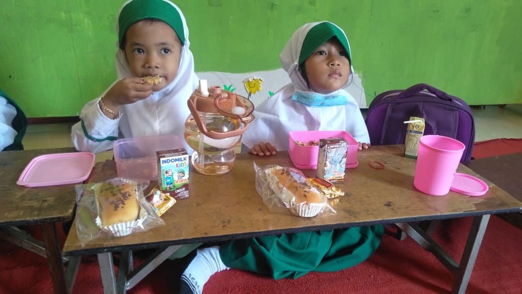 Program nutrisi sehat yang merupakan sumbangan dari para donatur ini, mulai dijalankan pada hari Senin, 25 September lalu, Pada hari senin ini, guru – guru Raudhatul Athfal (R.A) membagikan beberapa makanan sehat untuk para peserta didik. Makanan sehat yang dibagikan terdiri dari susu kotak rasa coklat, roti, dan juga wafer bola coklat. Setiap siswa mendapatkan satu buah roti, dua wafer bola dan satu kotak susu coklat. Anak – anak terlihat sangat senang mendapatkan susu, roti, dan juga coklat ini. Mereka pun terlihat menikmatinya bersama – sama di jam istirahat. (R.A)